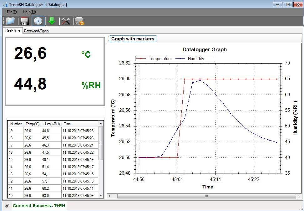 paměť pro 20 010 hodnot teploty a vlhkosti LCD displej o rozměrech 22 x 20 mm pro zobrazení aktuálních, minimálních a maximálních naměřených hodnot možnost nastavení načítání dat od 2 sekund do 24 hodin (2 až 30 s, dále 1, 5, 15, 30 min, dále 1, 5,12, 24 hodin) připojení k počítači přes USB port nastavitelný alarm horní a dolní meze pro teplotu a relativní vlhkost program TempRH Datalogger pro zobrazení naměřených hodnot pro OS Windows až do verze Windows 10 (32 bit a 64 bit) zobrazení naměřených dat v reálném čase v přiloženém programu včetně grafu možnost odloženého zahájení měření data ve formě zprávy v pdf fornátu a tabulky ve formátu *.csv a ve formátu *.imtr (Meter Files - lze otevřít přiloženým programem) součástí balení je datalogger, poutko, baterie, CD s programem a návod.