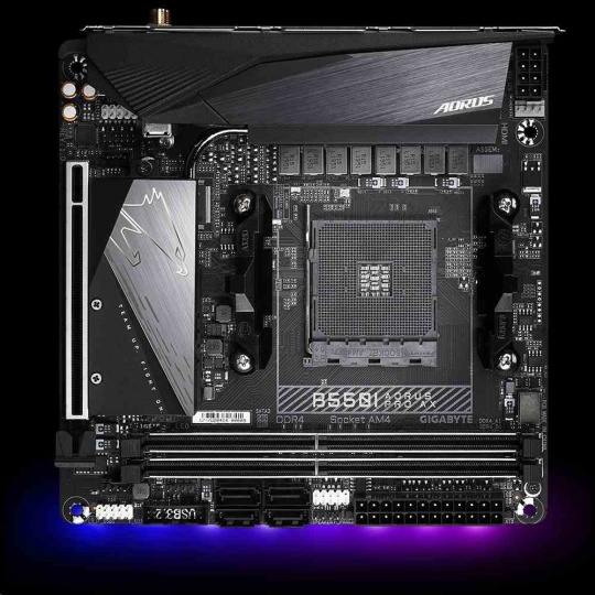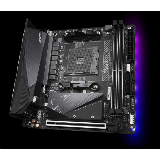 AMD B550 Mini-ITX AORUS Motherboard with Direct 8 Phases Digital VRM, Advanced Thermal Design with Extended VRM Heatsink, Thermal Baseplate, Dual PCIe 4.0/3.0 M.2 with Thermal Guard, Intel® WiFi 6E 802.11ax, 2.5GbE LAN, RGB FUSION 2.0, Q-Flash Plus