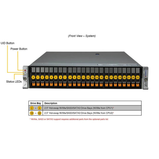 | Úložiště | Až 24x 2.5" NVMe/SATA/SAS hot-swap |