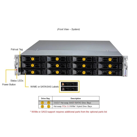 | Úložiště | Až 12x 3.5" SATA hot-swap + 2x M.2 NVMe |