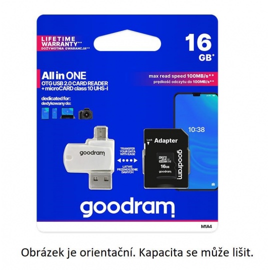 GOODRAM M1A4 All in One delivers versatility by providing functionality of few devices in one solution. It is a card reader equipped with USB 2.0 and micro USB connectors, allowing easy data transfer between computers, smartphones, tablets and cameras. It comes bundled with a fast UHS-I microCard.