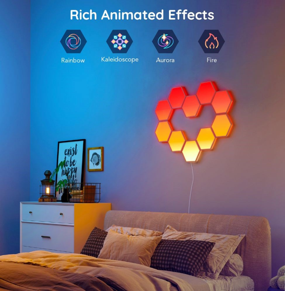 Díky vzájemné komunikaci panelů je možné s pomocí aplikace vytvořit nádherné, dynamické efekty. Technologie RGBIC pomáhá k ještě vyššímu jasu a kontrastu a vy si tak můžete vychutnat futuristické osvětlení svého herního doupěte nebo, ložnice nebo obývacího pokoje.