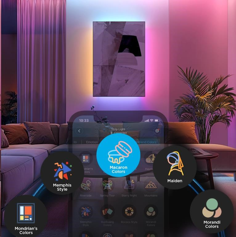 Pokročilý DIY režim LED Strip Light 2 Pro umožňuje vytvářet vlastní světelné efekty, zatímco desítky přednastavených scén vám poskytují okamžitou inspiraci pro různé příležitosti – od relaxačního večera po energickou párty. Každá scéna je navržena tak, aby maximálně využila možnosti plynulých přechodů barev a dynamických efektů. Se 16 miliony barev si můžete hrát s nekonečnými kombinacemi, které se dokonale přizpůsobí jakékoli atmosféře. Synchronizace s hudbou navíc zajišťuje, že světla oživí každý rytmus a zvýší zážitek z poslechu.