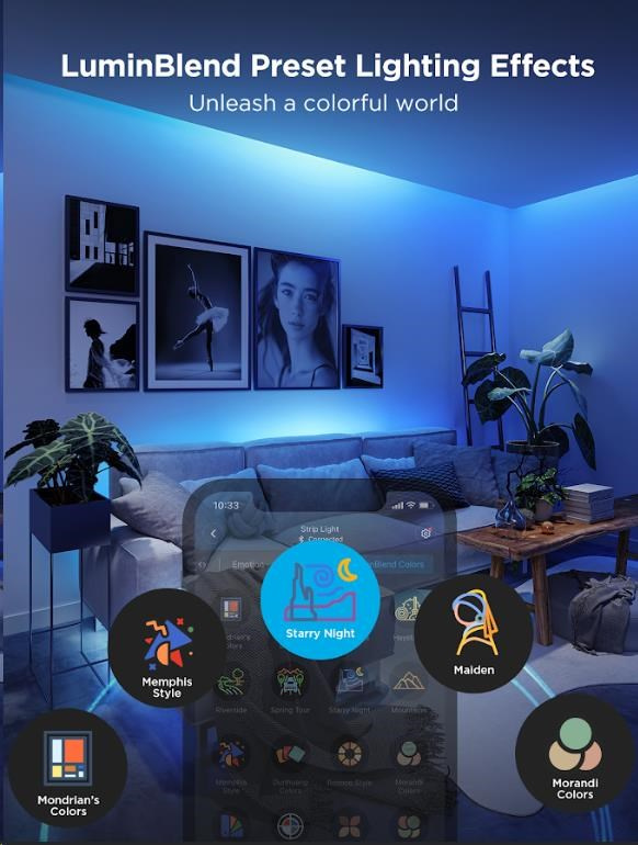 Pokročilý DIY režim LED Strip Light 2 Pro umožňuje vytvářet vlastní světelné efekty, zatímco desítky přednastavených scén vám poskytují okamžitou inspiraci pro různé příležitosti – od relaxačního večera po energickou párty. Každá scéna je navržena tak, aby maximálně využila možnosti plynulých přechodů barev a dynamických efektů. Se 16 miliony barev si můžete hrát s nekonečnými kombinacemi, které se dokonale přizpůsobí jakékoli atmosféře. Synchronizace s hudbou navíc zajišťuje, že světla oživí každý rytmus a zvýší zážitek z poslechu.