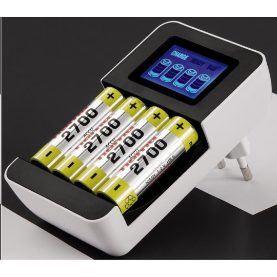 - zásuvková nabíječka pro 1-4 NiMH akumulátory AA (mignon) nebo AAA (micro) - 4 individuální nabíjecí sloty, každý akumulátor je monitorován a nabíjen samostatně (možnost nabíjení akumulátorů různého typu a kapacity současně) - LCD displej s grafickým zobrazením průběhu nabíjení - nabíjení řízené mikroprocesorem (ochrana proti přebíjení a přehřátí akumulátorů) - automatické ukončení nabíjení pomocí detekce Delta-U - bezpečnostní časová pojistka - detekce vadných akumulátorů - ochrana proti nesprávné polaritě Technické parametry: - typ nabíječky: automatická - konstrukce nabíječky: zásuvková (integrovaná síťová vidlice) - typ akumulátorů: NiMH, velikost AA (R6) mignon/AAA (R03) micro - nabíjecí proud: 450 mA (AA)/200 mA (AAA) - napájení: 100-240 V/50 Hz - barva: černá/bílá.