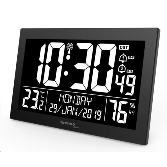 Digitální nástěnné hodiny s dvěma budíky s inverzním LCD displejem, časem řízeným rádiovým signálem DCF-77 a měřením vnitřní teploty a relativní vlhkosti • nástěnné hodiny s možností postavení • velikost inverzního displeje 110 x 194 mm • čas řízený rádiovým signálem DCF-77 • formát zobrazení času 12, nebo 24 hodin • datum s názvem dne (jazyk EN, DE, FR, IT, ES, NL a DK) • 2 budíky - pro pracovní dny a víkend • funkce opakovaného buzení (Snooze) s nastavitelným časem od 5 do 60 minut • buzení zvukovým signálem ( 20 sekund 1 pípnutí za sekundu, poté 20 sekund 2 pípnutí za sekundu, poté 20 sekund 4 pípnutí za sekundu a poté stálé pípání) • datum • časová zóna od -2 do +2 hodin • měření vnitřní teploty a relativní vlhkosti • ikona slabých záložních baterií • napájení na síťový adaptér a záložní baterie • barva černá.
