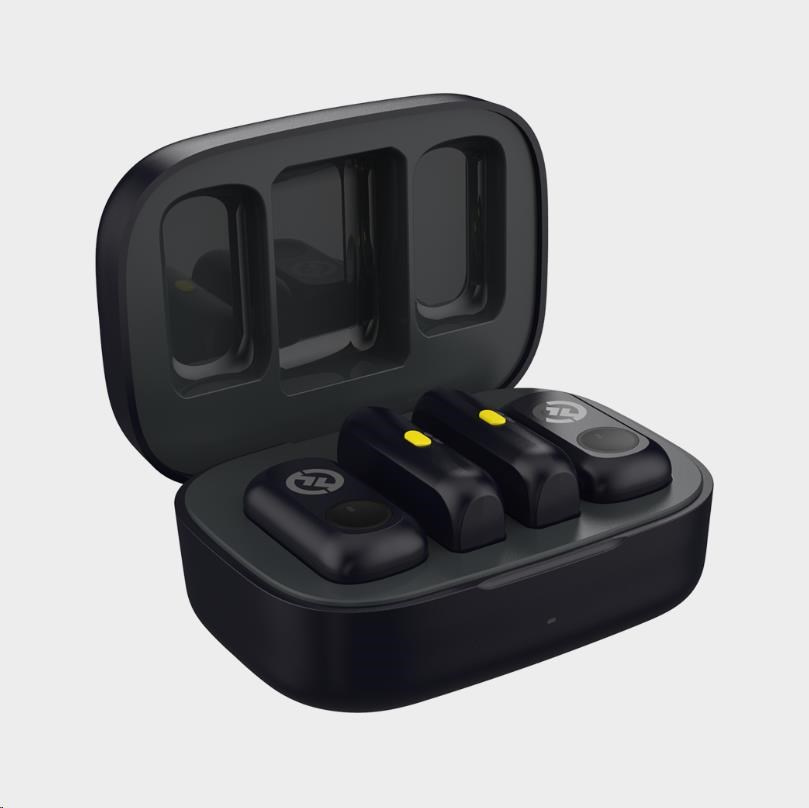 Battery life is built for long days. The transmitters last up to 9 hours on a single charge, and the included charging case provides up to two full recharges—offering around 27 hours of total use without needing a power outlet. Setup is automatic: just connect the receiver, and you’re ready to record or livestream.