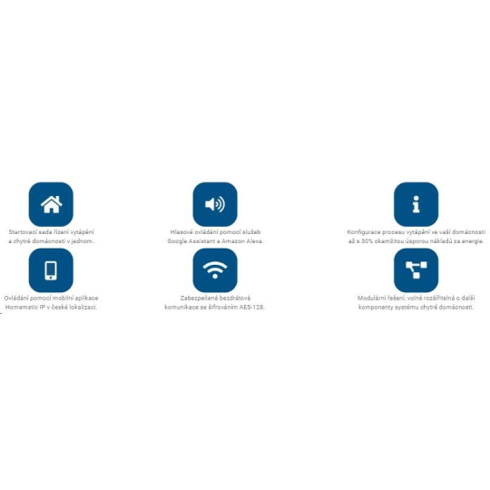 Startovací sada pro řízení vytápění HmIP-SET1 určená pro počáteční integraci chytré domácnosti Homematic IP. Sada obsahuje čtyři základní zařízení pro spolehlivé řešení regulace vytápění dle individuálních potřeb, což vede k okamžité úspoře a snížení výdajů na energie až o 30 %. Sada obsahuje Centrální jednotku HmIP-HAP, 2x Termostatickou hlavici HmIP-eTRV-2, Nástěnný termostat se senzorem teploty a vlhkosti HmIP-WTH-1 a bezplatnou mobilní aplikaci v CZ lokalizaci dostupnou pro operační systém Android a iOS.