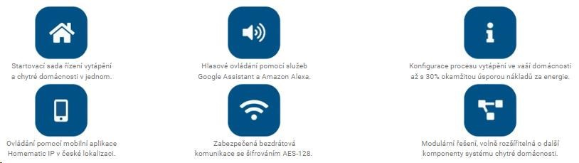 Rozšířená startovací sada pro řízení vytápění HmIP-SET2 určená pro počáteční integraci chytré domácnosti Homematic IP. Sada obsahuje šest základních zařízení pro spolehlivé řešení regulace vytápění a vzdálené řízení prostorové teploty v místnosti dle individuálních potřeb, což vede k okamžité úspoře a snížení výdajů na energie až o 30 %. Sada obsahuje Centrální jednotku HmIP-HAP, 3x Termostatickou hlavici HmIP-eTRV-2, 2x Nástěnný termostat se senzorem teploty a vlhkosti HmIP-WTH-1 a bezplatnou mobilní aplikaci v CZ lokalizaci dostupnou pro operační systém Android a iOS.