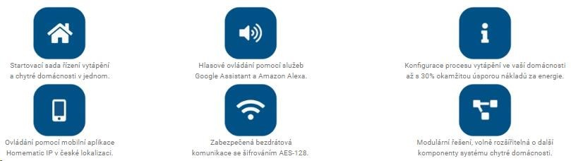 Startovací sada pro řízení vytápění HmIP-SET1 určená pro počáteční integraci chytré domácnosti Homematic IP. Sada obsahuje čtyři základní zařízení pro spolehlivé řešení regulace vytápění dle individuálních potřeb, což vede k okamžité úspoře a snížení výdajů na energie až o 30 %. Sada obsahuje Centrální jednotku HmIP-HAP, 2x Termostatickou hlavici HmIP-eTRV-2, Nástěnný termostat se senzorem teploty a vlhkosti HmIP-WTH-1 a bezplatnou mobilní aplikaci v CZ lokalizaci dostupnou pro operační systém Android a iOS.