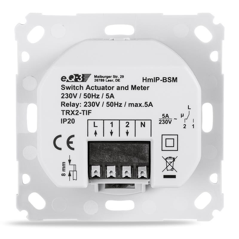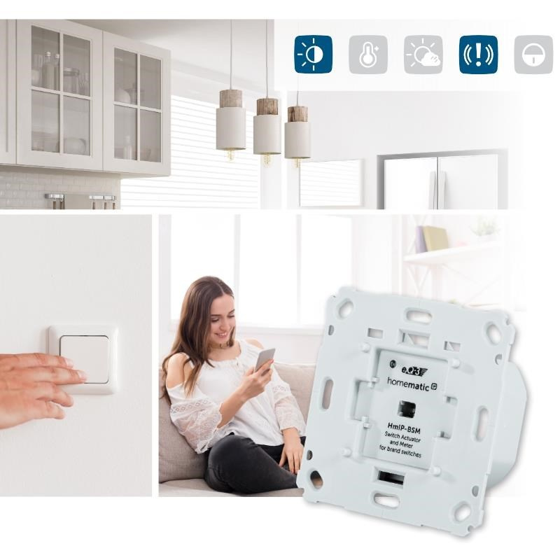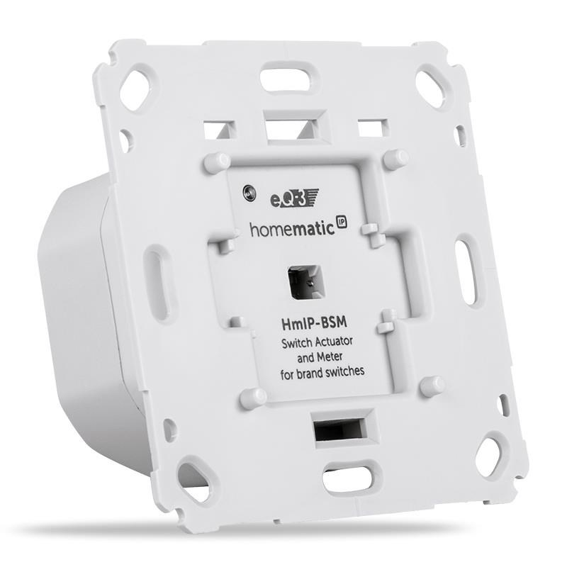 Programovatelný bezdrátový Spínací akční člen s měřením (HmIP-BSM-I) pro zápustnou montáž, napájený ze sítě 230 V, je součástí systému chytré domácnosti Homematic IP.