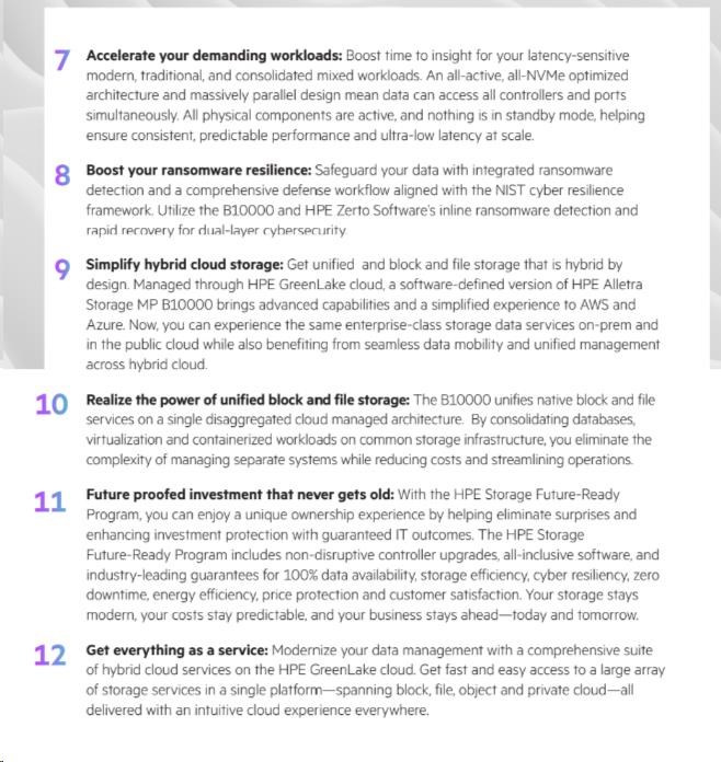Žádné kompletní výměny: Díky programu HPE Timeless Storage pro HPE Alletra Storage MP B10000 můžete chránit své investice a udržovat úložiště neustále aktuální pomocí aktualizace řadiče bez přerušení provozu. Tím se sníží vaše celkové náklady na vlastnictví a ušetříte v průměru 30 % oproti tradičním kompletním výměnám. Neustále se zlepšující datové služby: Využijte plný potenciál HPE Alletra Storage MP B10000 s naším komplexním předplatným softwaru. Získejte přístup ke všem funkcím a vylepšením našeho operačního systému, včetně cloudových operací řízených umělou inteligencí v cloudu HPE GreenLake, bez dalších nákladů. Spolehněte se na 100% dostupnost dat – zaručeno: Zapomeňte na přerušení provozu způsobená neočekávanými výpadky. HPE Alletra Storage MP B10000 je platforma řízená umělou inteligencí, rozdělená a bez jediného bodu selhání, která zaručuje odolnou 100% dostupnost dat pro každého zákazníka a každé pole. Ukládejte více za méně s HPE StoreMore Guarantee: To zaručuje celkovou úsporu minimálně 4:1 pro vaše pracovní zatížení – snížení nákladů na fyzické úložiště, úsporu energie a zmenšení stopy datového centra. 30denní záruka spokojenosti: Vyzkoušejte HPE Alletra Storage MP B10000 po dobu 30 dnů bez rizika. Pokud nebudete zcela spokojeni s výhodami a schopnostmi vašeho úložného systému, jak jsou popsány v produktových specifikacích, budeme s vámi spolupracovat na nápravě.