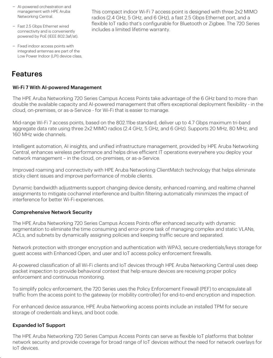 Designed to deliver cutting-edge Wi-Fi performance, the HPE Aruba Networking 720 Series Campus Access Points offer enterprises a cost-effective solution that meets the demand for fast, secure, high-performance connectivity. Leveraging the latest Wi-Fi 7 standard, these access points enhance security across both wired and wireless networks, support Internet of Things (IoT) devices, and provide accurate location-aware capabilities. HPE Aruba Networking Central helps drive efficient operations and provides AI-automation and machine learning (ML) insights for fine-tuned wireless connectivity across diverse environments. Like all the HPE Aruba Networking access points, this series is Wi-Fi CERTIFIED and includes a limited lifetime warranty for investment protection.