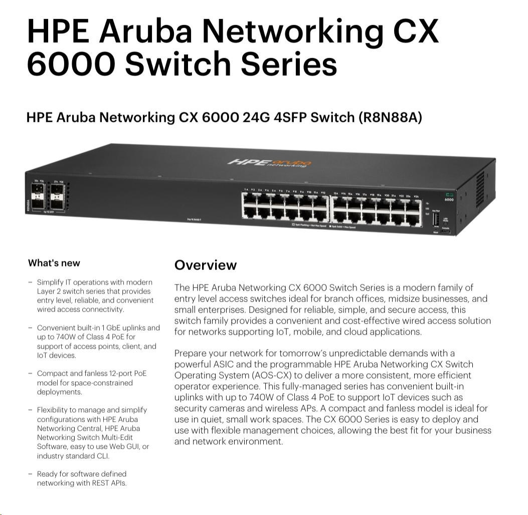 The HPE Aruba Networking CX 6000 Switch Series is a modern family of entry-level access switches ideal for branch offices, midsize businesses, and small enterprises. Optimized for reliable, simple, and secure access, the CX 6000 Switch series provides a convenient and cost-effective wired access solution for networks supporting IoT, mobile, and cloud applications.