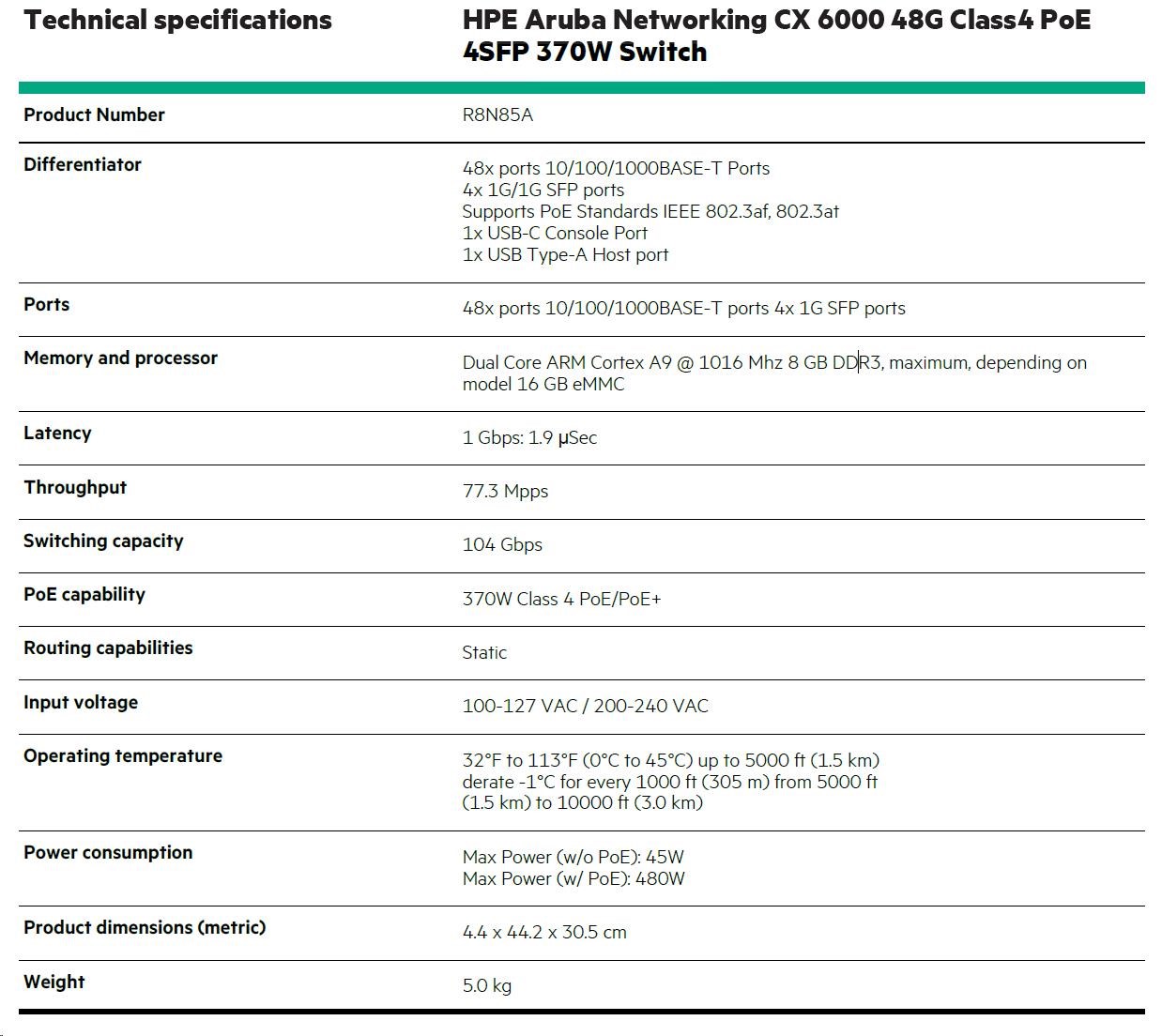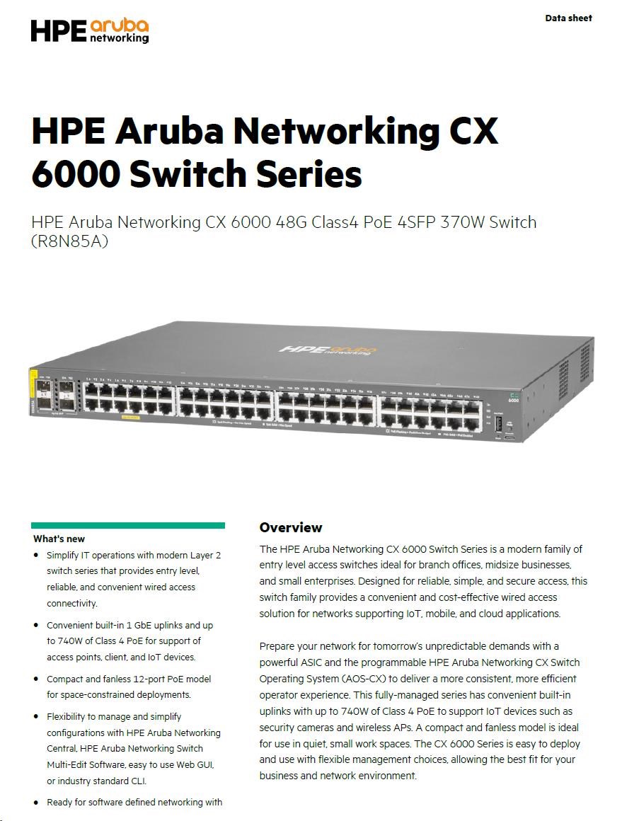 HPE Aruba Networking CX 6000 48G Class4 PoE 4SFP 370W Switch.