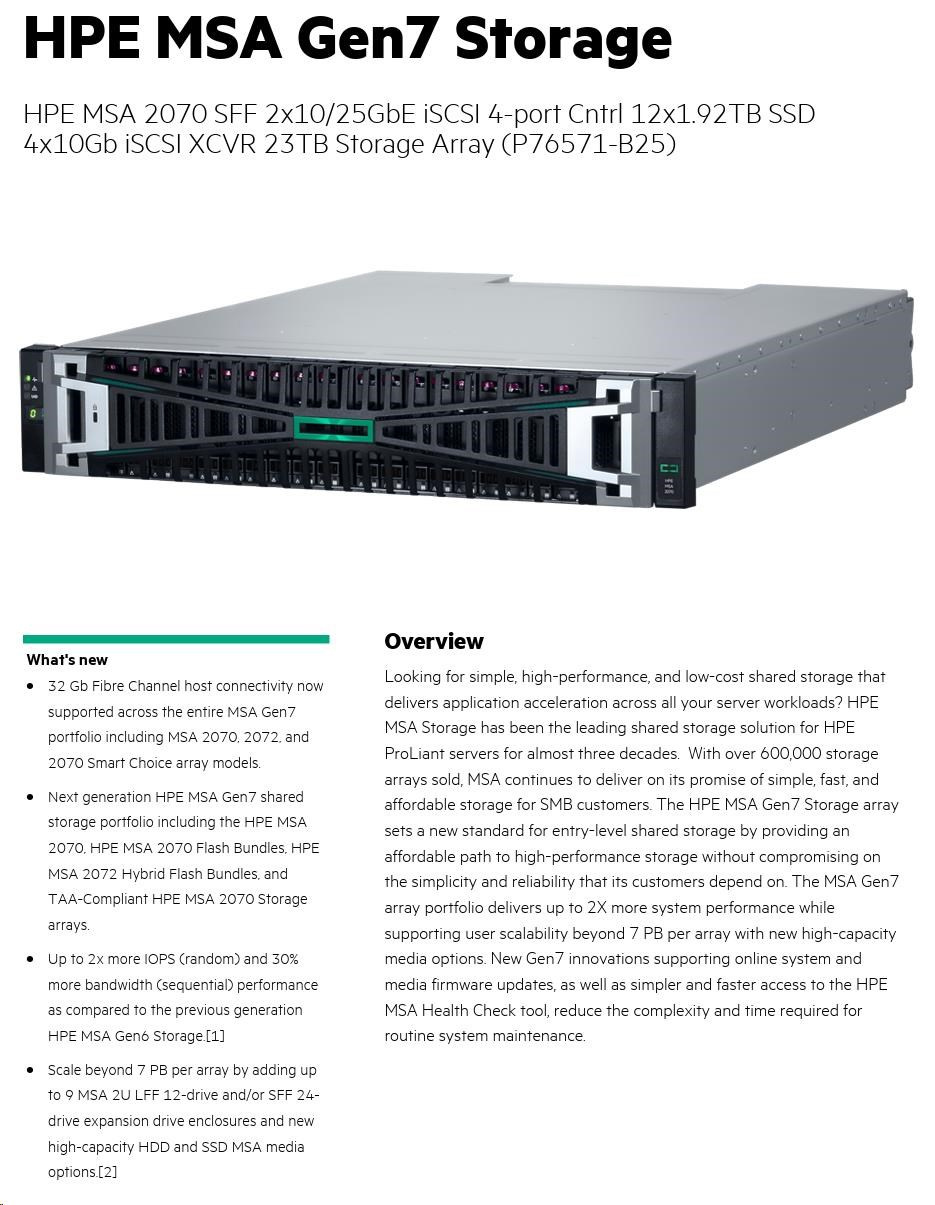 HPE MSA 2070 SFF 2x10/25GbE iSCSI 4-port Cntrl 12x1.92TB SSD 4x10Gb iSCSI XCVR 23TB Storage Array.