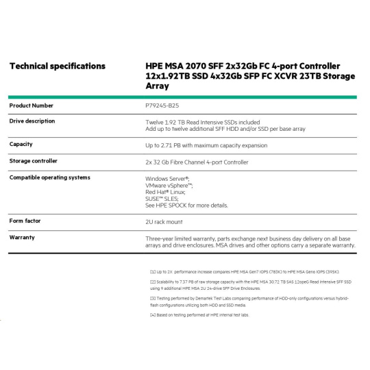 HPE MSA 2070 SFF 2x32Gb FC 4-port Controller 12x1.92TB SSD 4x32Gb SFP FC XCVR 23TB Storage Array Smart Choice