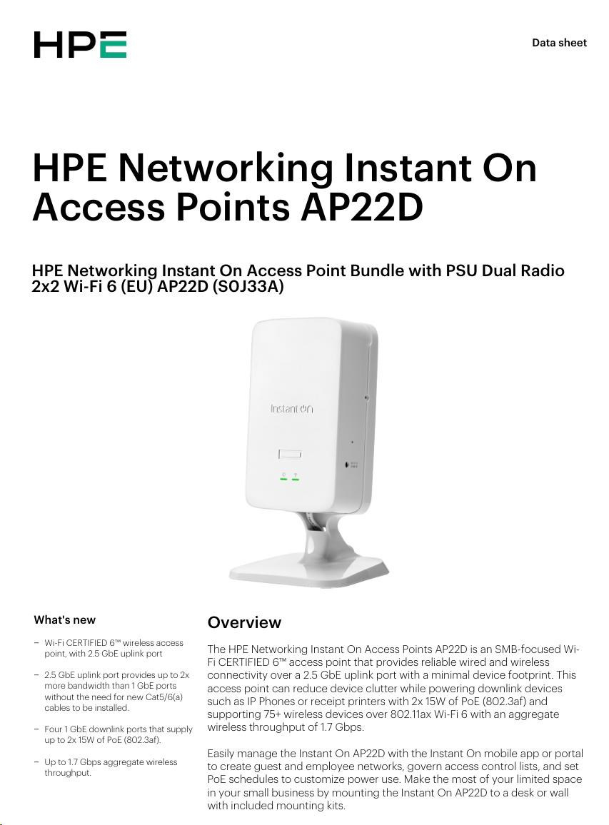 HPE Networking Instant On Access Point AP22D Bundle with PSU Dual Radio 2x2 Wi-Fi 6 (EU) AP22D.