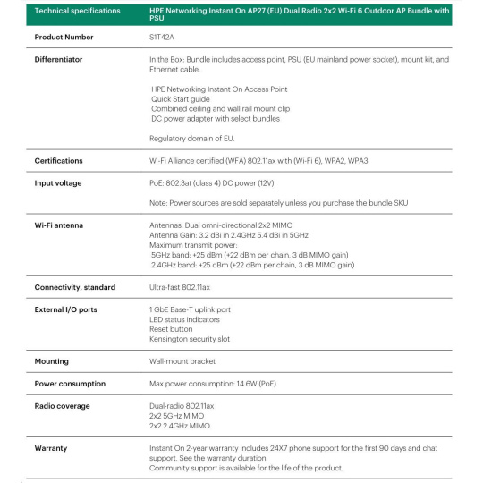 HPE Networking Instant On AP27 (EU) Dual Radio 2x2 Wi-Fi 6 Outdoor AP Bundle with PS (Includes 30W PoE midspan injector with EU Power Cord)