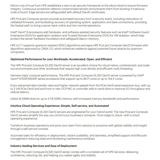 HPE ProLiant Compute DL320 Gen12 servers are engineered for your hybrid world. The new ProLiant Compute Gen12 servers simplify the way you control your business’s compute—from edge to cloud—with a cloud operating experience.
