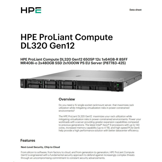 The HPE ProLiant DL320 Gen12 maximizes your rack utilization while mitigating virtualization risks in power-constrained environments. Power your workloads with a server providing greater expansion capabilities compared to previous generations. The latest Intel® Xeon® 6 processors with up to 144 cores, increased memory capability (up to 4 TB), and high-speed PCIe Gen5 help provide a high performance solution with better datacenter efficiency.