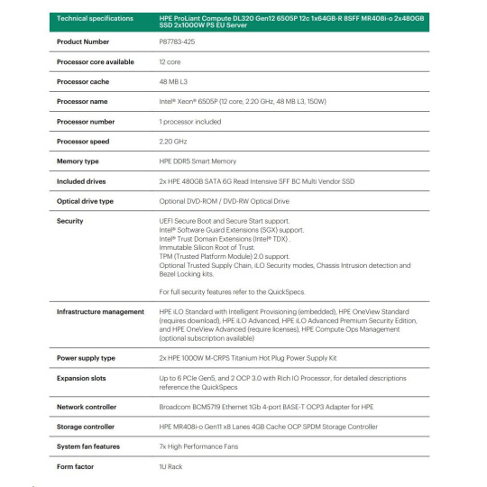 HPE PL DL320g12 6505P (2.2/12C) 1x64G (P69728) 2x480G MR408i-o 8SFF 2x1000W 1GbE NBD333 Smart Choice (P87783-425)