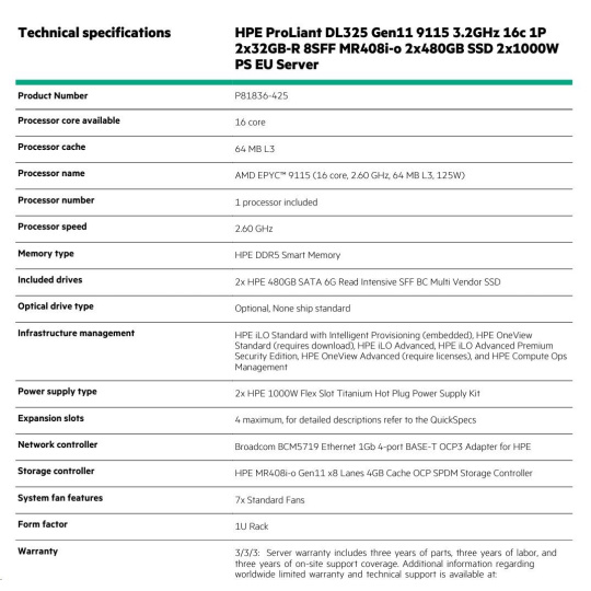 HPE PL DL325g11 AMD Epyc 9115 (2.6-4.1/16C) 2x32G 6400 2x480G 2x1000W MR408i-o/4G 8SFF 4p1Gocp Smart Choice