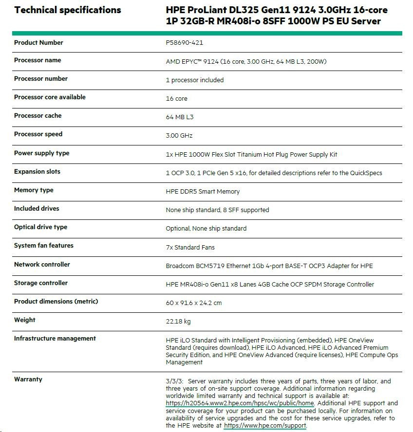 HPE ProLiant DL325 Gen11 9124 3.0GHz 16-core 1P 32GB-R MR408i-o 8SFF 1000W PS EU Server