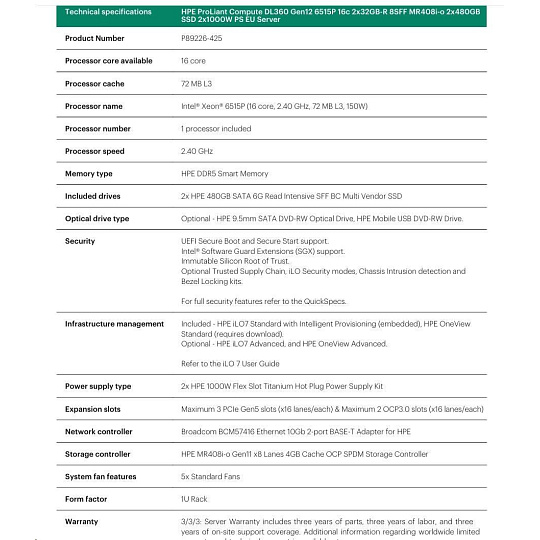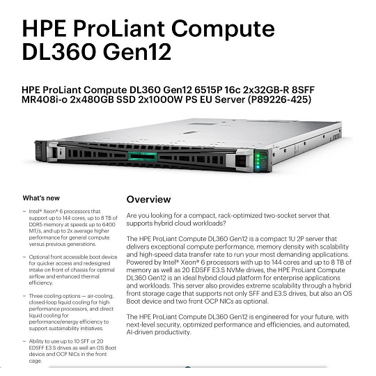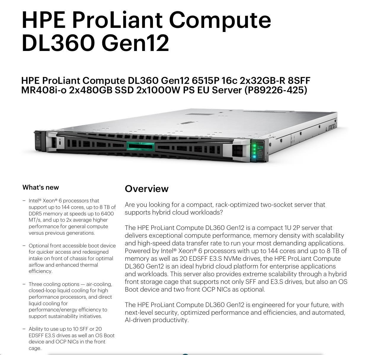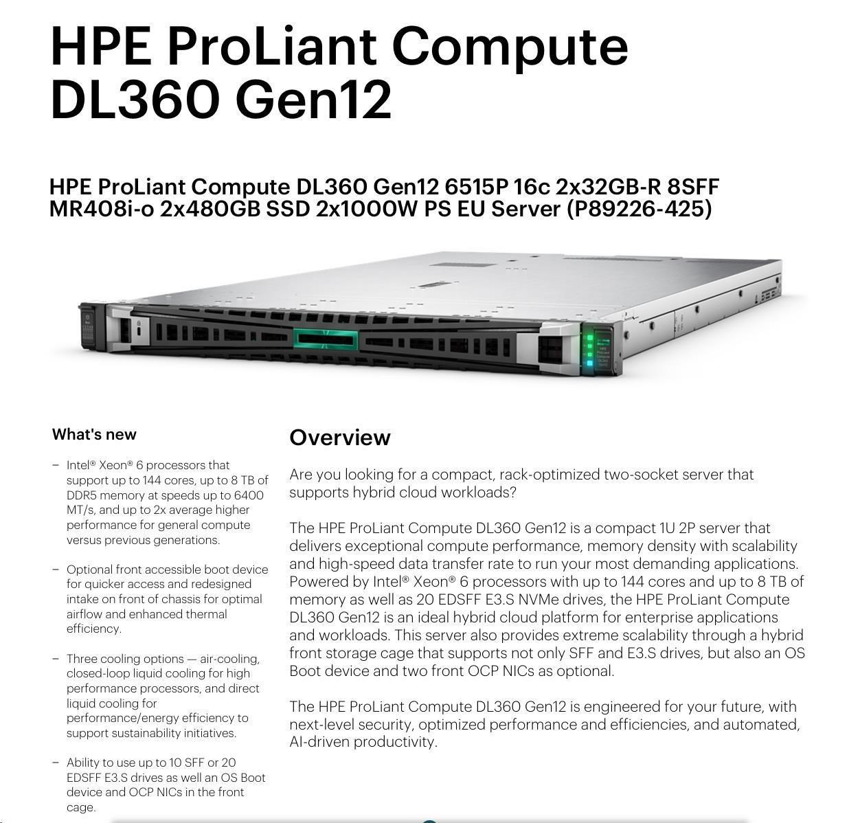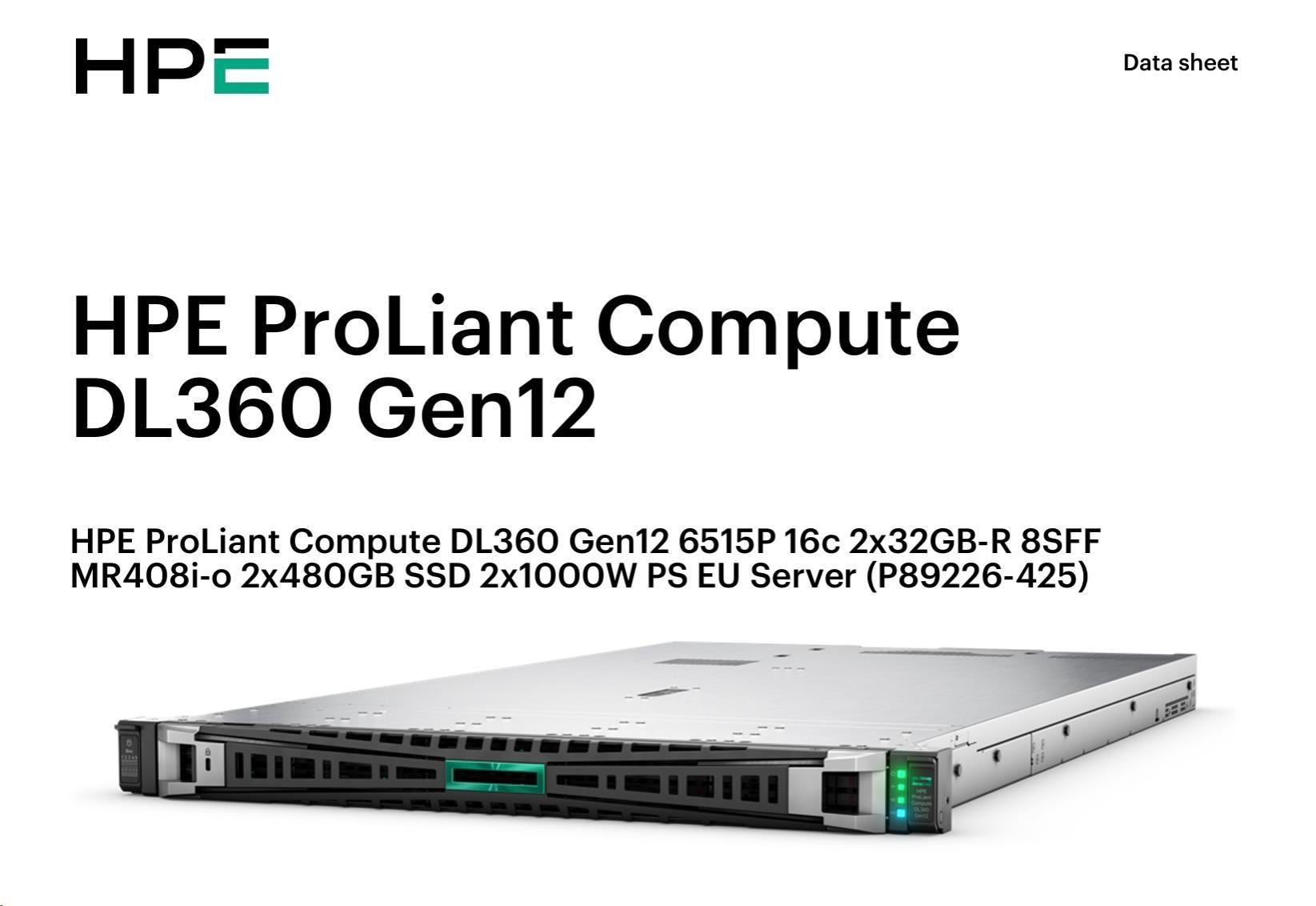 HPE PL DL360g12 6515P (2.4/16C) 4x32G (P69727) NS204i-uv2 MR408i-o 8SFF 2x1000W NBD333 Smart Choice