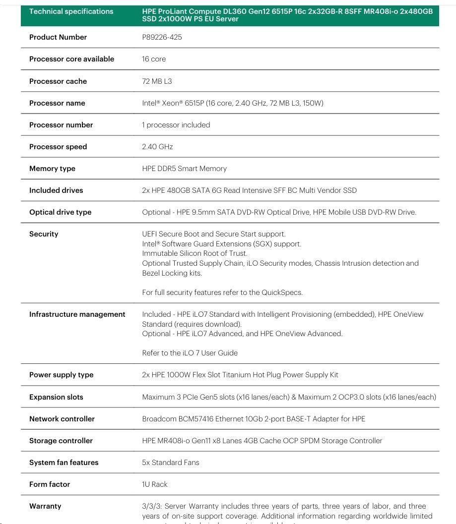 Provedení serveru:Rack, 1U Rack; Výrobce CPU:Intel; Maximální počet procesorů:2; Řada procesorů:Intel 16 Core Xeon; Model procesoru:Intel Xeon 6515P; Výkon CPU dle PassMark:43798; Velikost paměti RAM (GB):64; Maximální paměťová kapacita serveru (GB):256; Maximální počet slotů PCIe:2; Maximální počet HDD v serveru:8; Hot-plug cage pro HDD:2.5" SFF.... více