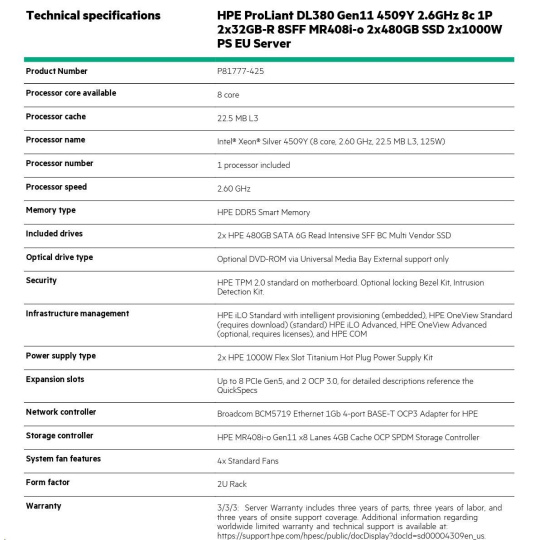 HPE PL DL380g11 4509Y (2.6/8C) 2x32G (p64706) 8SFF MR408i-o 2x480G 2x1000W 4x1Gb NBD333 Smart Choice