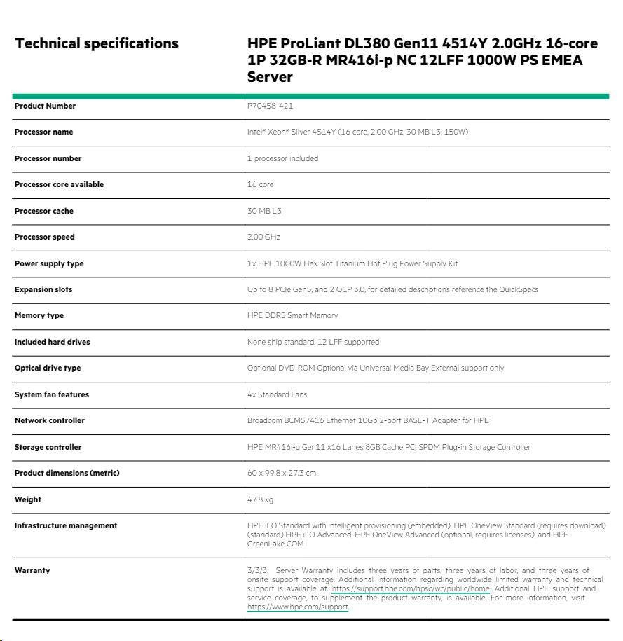 Model Name HPE PL DL380g11 4514Y (2.0/16C/30M) 32G MR408i-o/4G 12LFF 1000Wti 2x10G-T