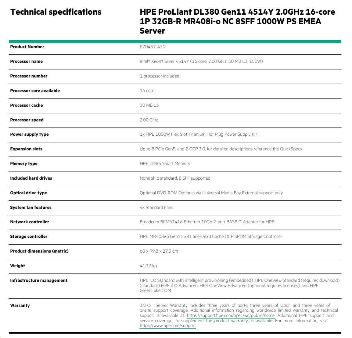 Model Name HPE PL DL380g11 4514Y (2.0/16C/30M) 32G MR408i-o/4G 8-26SFF 1000Wti 2x10G-T