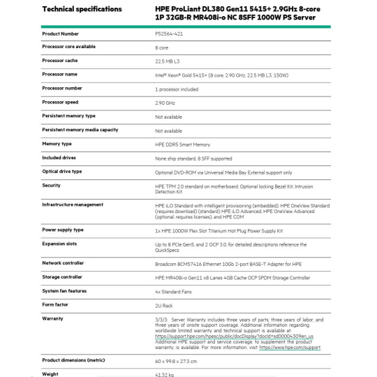 Model Name HPE PL DL380g11 5415+ (2.9/8C/23M/4400) 32G MR408i-o/4G 8-26SFF 1000Wtit 2x10G iLO6 base-T 2U NBD333