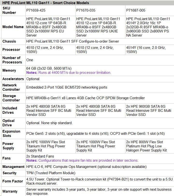HPE PL ML110g11 4510 (2.4G/12C) NS204(2x480) 2x32G (P64706) MR408i-o 2x1000W 8SFF 2x1G NBD333 Smart Choice.