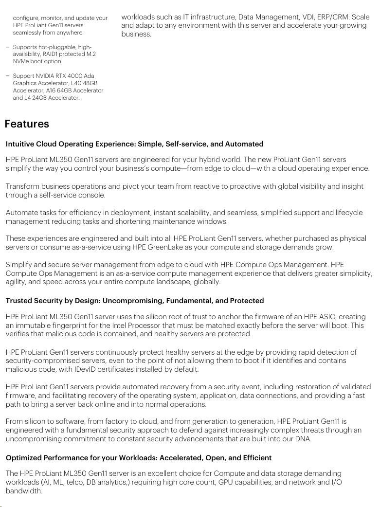 | Management | HPE iLO Standard with Intelligent Provisioning (embedded), HPE OneView Standard (requires download); HPE iLO Advanced and HPE OneView Advanced (require licenses) |