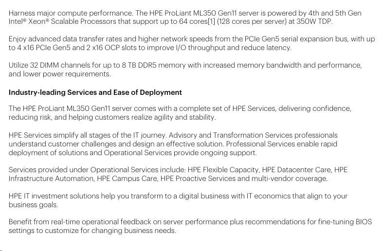 | Chassis | HPE ProLiant ML350 Gen11 LFF Configure-to-order Server |