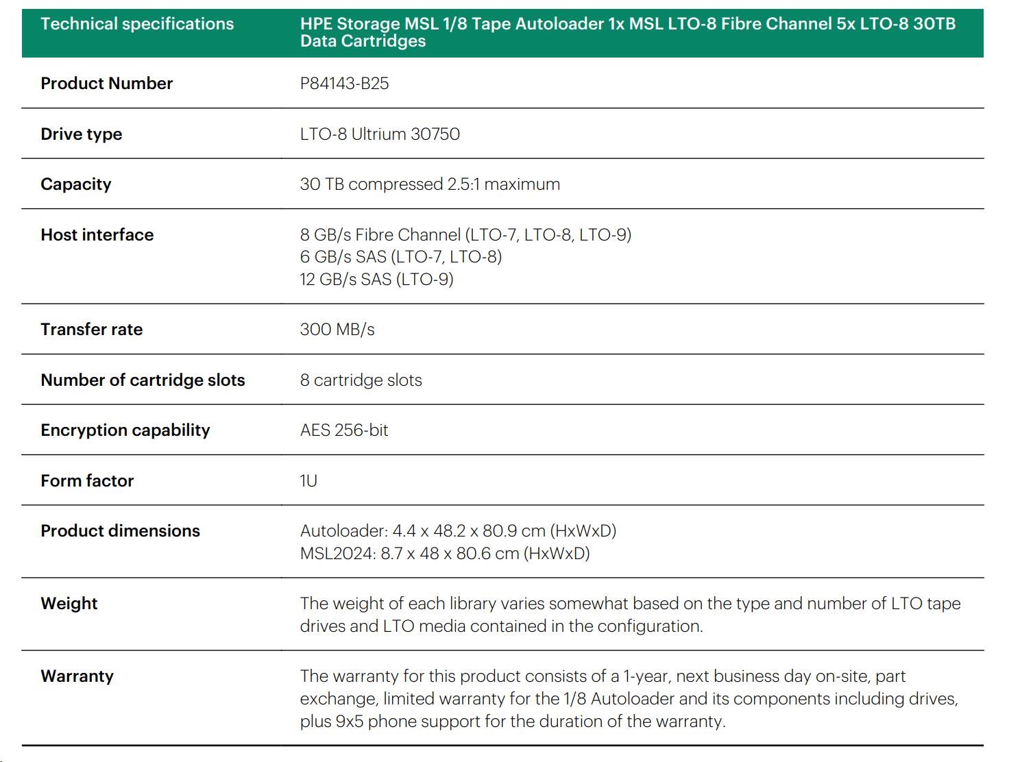 HPE Storage MSL 1/8 Tape Autoloader 1x MSL LTO-8 Fibre Channel 5x LTO-8 30TB Data Cartridges.
