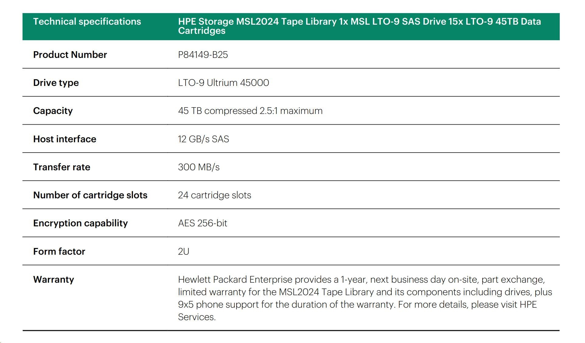 HPE Storage MSL2024 Tape Library 1x MSL LTO-9 SAS Drive 15x LTO-9 45TB Data Cartridges