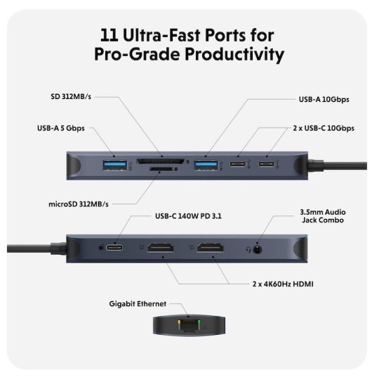 Hyper® EcoSmart™ Gen.2 Dual HDMI USB-C 11-in-1 Hub 140W PD 3.1 Pass-thru