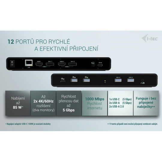 i-tec Universal Dual 4K Display Docking Station, Power Delivery 85W + i-tec USB-C Charger 100W