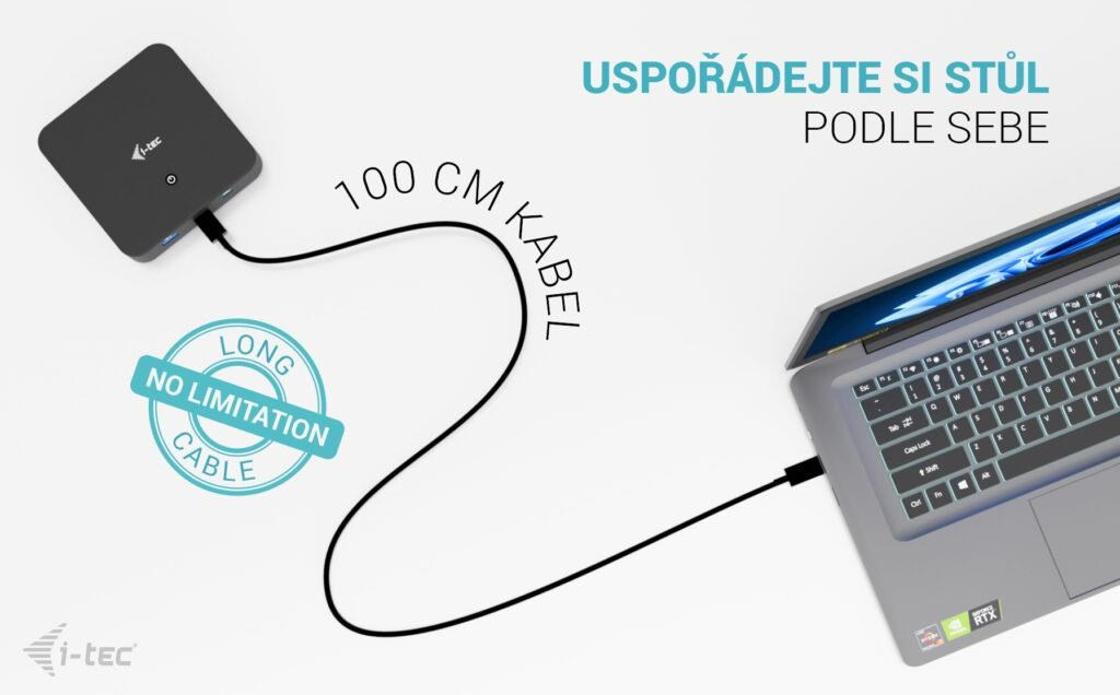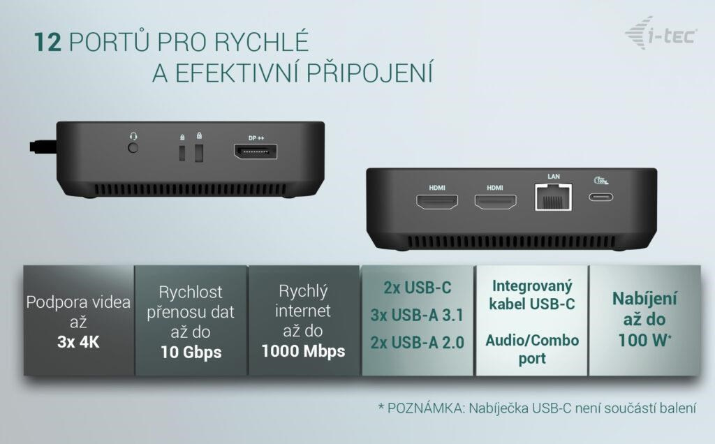 Poznámka: Napájecí adaptér není součástí balení. Dokovací stanici lze napájet originálním adaptérem notebooku, nebo je možné dokoupit volitelný napájecí adaptér (kód i-tec: CHARGER-C100W).