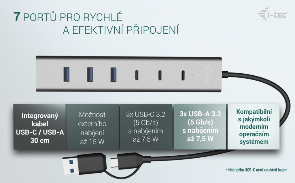 - Nabíjecí HUB USB-A/USB-C, až pro 7 zařízení