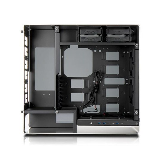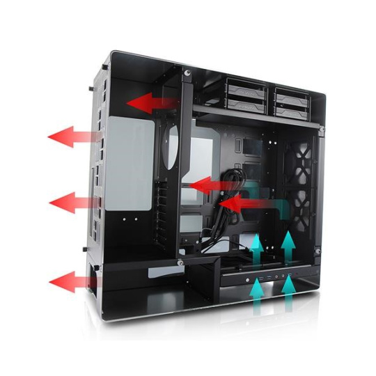 Oddělené pozice HDD a PSU zajišťují ideální proudění vzduchu skrz skříň ven zadními větracími otvory, aniž by se odvod teplého vzduchu brzdil o základní desky nebo grafické karty.