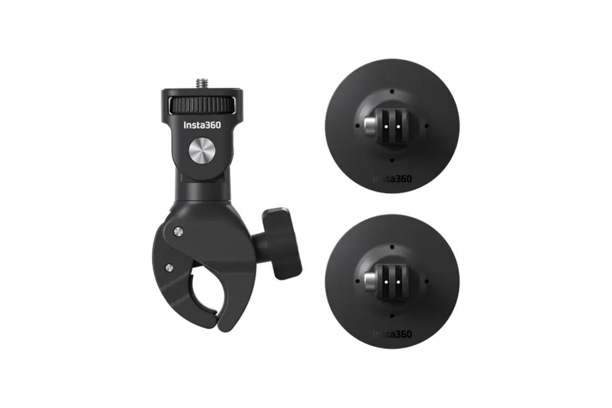 Montážní sada kamery na motorku Insta360. Obsahuje objímku na řidítka, dva samolepicí držáky na helmu, dva adaptéry se stativovým závitem, adaptér s vnitřním stativovým závitem, pojistné šrouby a plastové vložky. Součástí sady je i šestihranný klíč a utahovací nástroj..