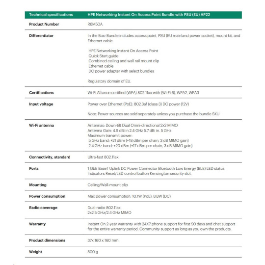 HPE Networking Instant On Access Point Bundle with PSU (EU) AP22 (Includes 12V Power Adapter with EU Power Plug) R6M50A
