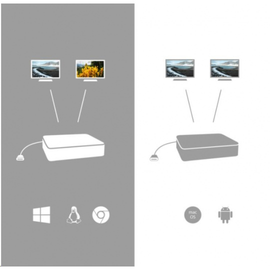 * Operační systém macOS nepodporuje technologii více-obrazového video přenosu Multi Stream Transport (MST), což znamená, že v případě připojení k macOS bude na obou připojených monitorech promítnut stejný obraz.