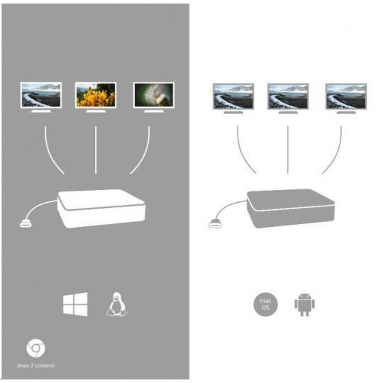 1/ Operační systém macOS nepodporuje technologii více-obrazového video přenosu Multi Stream Transport (MST), což znamená, že v případě připojení k macOS bude na všech připojených monitorech promítnut stejný obraz.