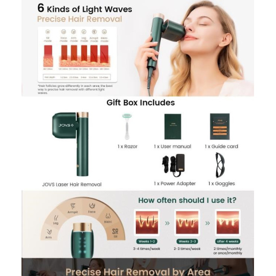 *Toto zařízení může používat kdokoli s typem pleti I až V na Fitzpatrickově stupnici. Pokud máte velmi tmavý odstín pleti (typ VI), toto zařízení prosím nepoužívejte. JOVS Pro II lze použít k ošetření tmavých blond až černých typů chloupků, ale nelze jej použít k ošetření světlých blond, zrzavých nebo šedivých chloupků.