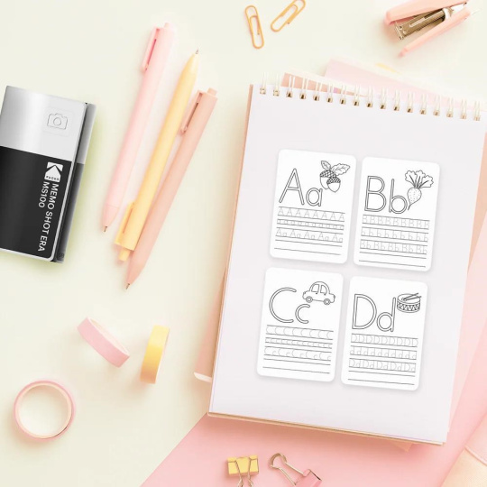Fotoaparát s tiskem etiket inspirovaný ikonickým designem filmových kazet Kodak. Pořiďte snímky a okamžitě je vytiskněte, nebo připojte telefon a tiskněte obrázky z galerie na etiketový papír o velikosti 2,7 × 1,8" prostřednictvím aplikace KODAK MEMO.